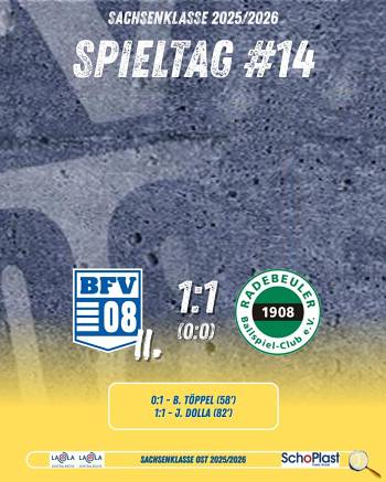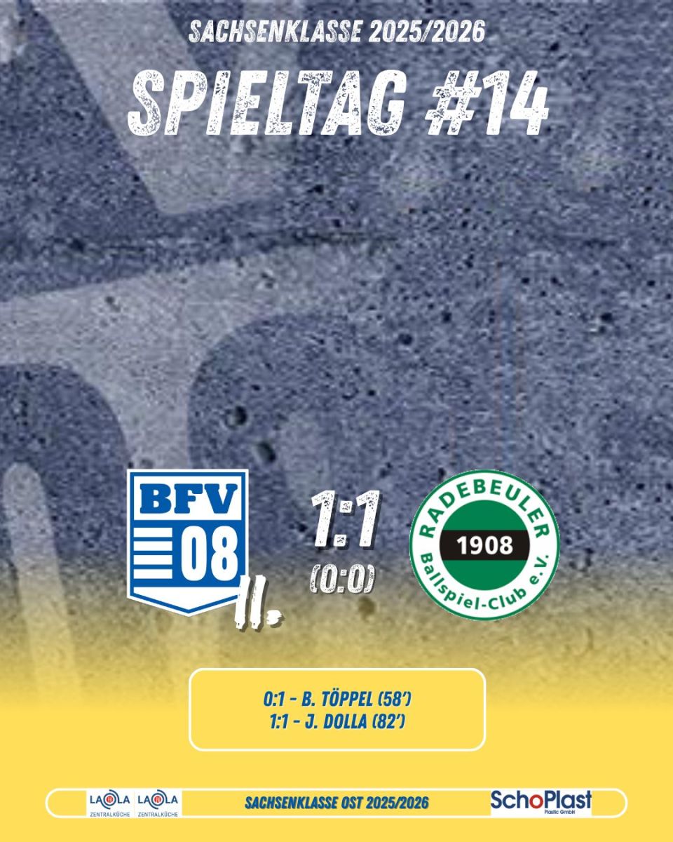 Unsere U23 hat es im gestrigen letzten Heimspiel der Sachsenklasse-Hinrunde trotz bester Chancen verpasst, einen wichtigen Sieg einzufahren. Gegen den Radebeuler BC reichte es leider nur zu einer Punkteteilung. Ex-BFV-Akteur Benno Töppel (von 2013 bis 2018 für unsere 1.Männermannschaft aktiv) sorgte mit einem Fernschuss für die Gästeführung, Johannes Dolla gelang in der Schlussphase der verdiente und überfällige Ausgleichstreffer.