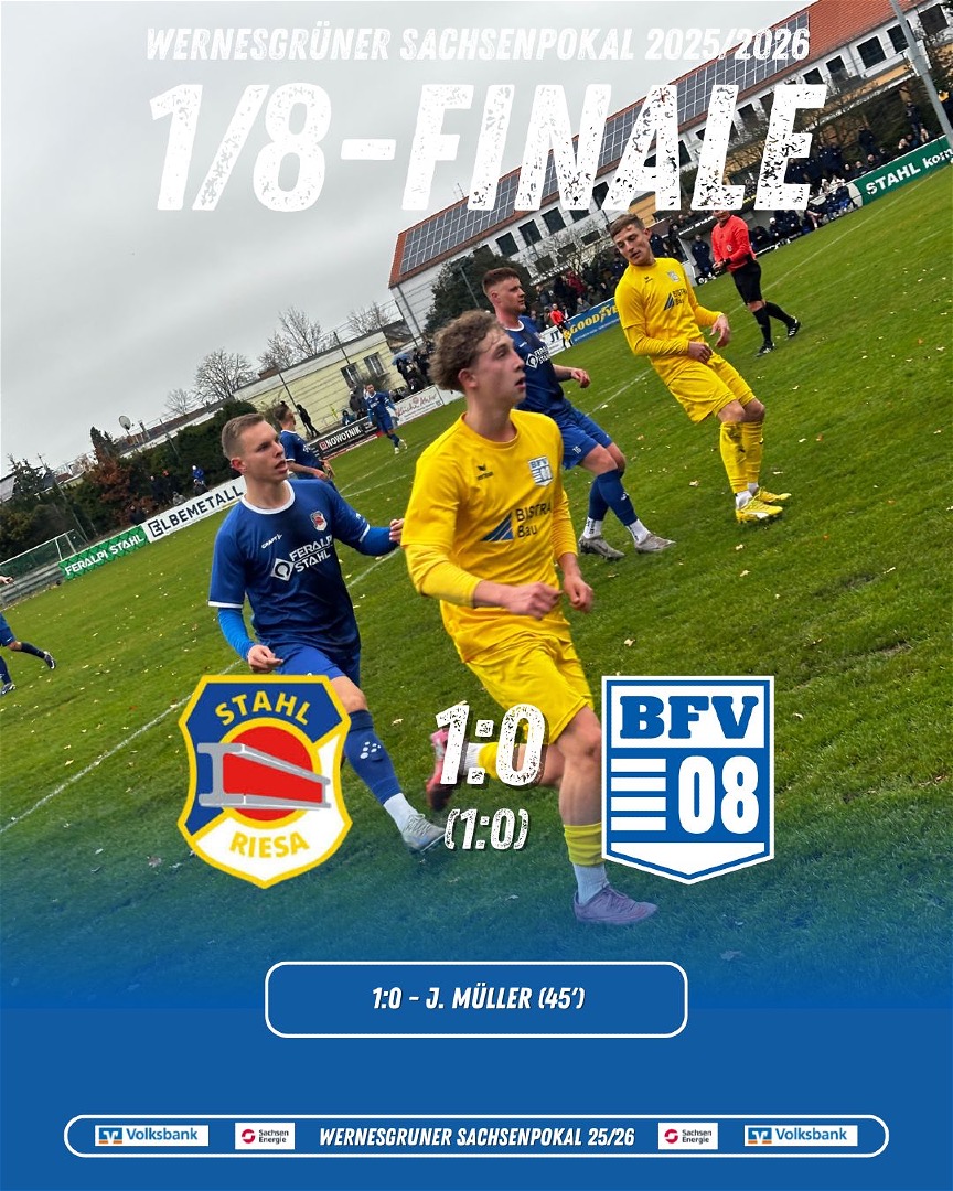 Der Sachsenpokalwettbewerb ist für unseren Oberligakader vorbei. Am heutigen Samstag-Nachmittag unterlag man beim Landesligisten BSG Stahl Riesa mit 0:1 und verpasste damit die Chance auf einen Startplatz im Viertelfinale im März 2026.