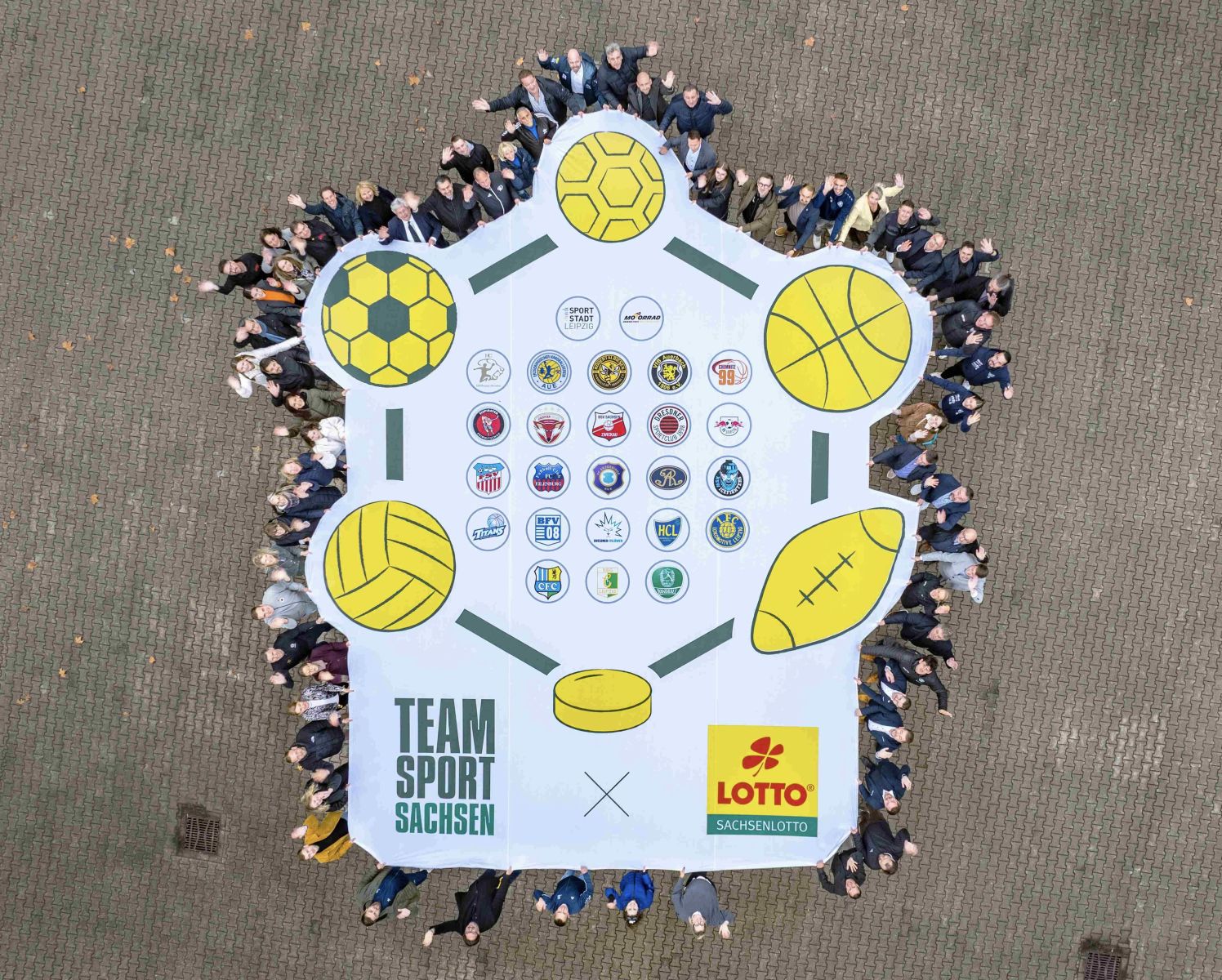 Wie vielfältig und emotional der Sport in Sachsen erlebbar ist, zeigt auch die im Anschluss an das Pressegespräch eröffnete Ausstellung „Emotionale Sportmomente“ im Lotto-Haus. Präsentiert werden eindrucksvolle Spielmomente der vergangenen Saison, zur Verfügung gestellt von den Mitgliedsvereinen des TeamSportSachsen e.V. Unter anderem teilten Fußballer Farid Abderrahmane (1. FC Lok Leipzig), Handballer Simon Ernst (SC DHfK Leipzig), Football-Spieler Hermann Schramm (Dresden Monarchs) und NINERS-Geschäftsführer Steffen Herhold im Rahmen der Vernissage ihre persönlichen Erinnerungen zu den präsentierten Motiven. Für eine bleibende Erinnerung sorgten die Mitarbeiterinnen und Mitarbeiter von Sachsenlotto sowie Vertreterinnen und Vertreter der TeamSportSachsen-Vereine mit der Umsetzung eines großformatigen Mannschaftsfoto. Das ausgerollte Banner steht stellvertretend für Energie, Begeisterung und Teamgeist – Werte, die die Zusammenarbeit seit Jahren prägen. Gleichzeitig setzt das Foto-Projekt ein Zeichen für Nachhaltigkeit: Das Textilbanner wird im Jahr 2026 vom Förderverein Chemnitzer Schulmodell im Rahmen einer Projektwoche weiterverarbeitet und zu Kostümen und Requisiten umgestaltet.