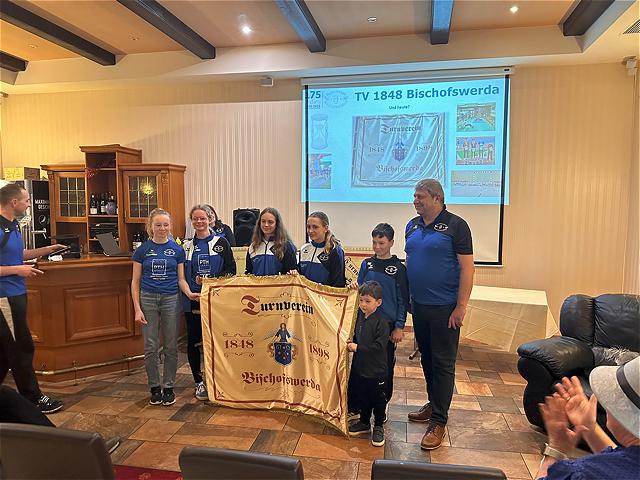 Während der TV 1848 „seine Geschichte“ rund um seine wunderschöne Vereinsfahne aufbaute, lieferte unser Uwe Barkow mit zahlreichen Annekdoten und Original-Utensilien rund um unsere DDR-Oberliga-Zeit Ende der 80er Jahre ab und gab mit Hilfe einiger interessanter Bilder und Tino Gottlöber an seiner Seite unter anderem auch zur noch jungen Historie unserer Frauen- und Mädchenabteilung zahlreichen Aufschluss.